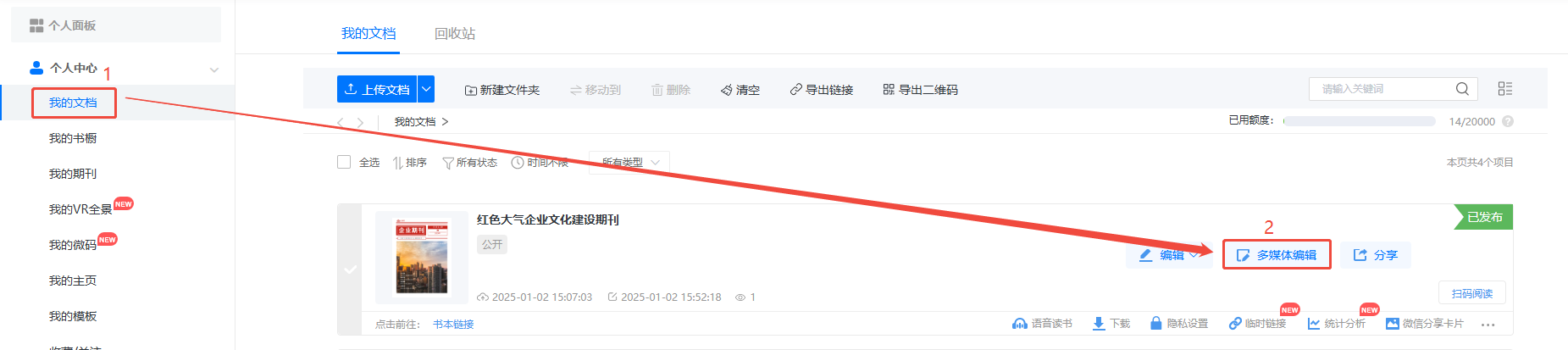 點進【我的文檔】/【文檔】,選擇對應(yīng)電子書,點擊【多媒體編輯】/【內(nèi)容編輯】。