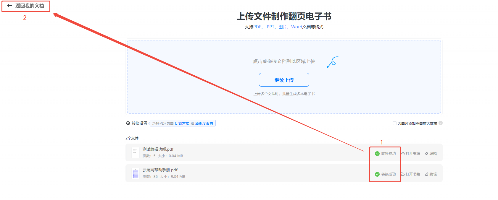 當(dāng)顯示【轉(zhuǎn)換成功】時(shí),就意味著電子畫(huà)冊(cè)已經(jīng)生成了,可以點(diǎn)擊左上角【返回我的文檔】查看。