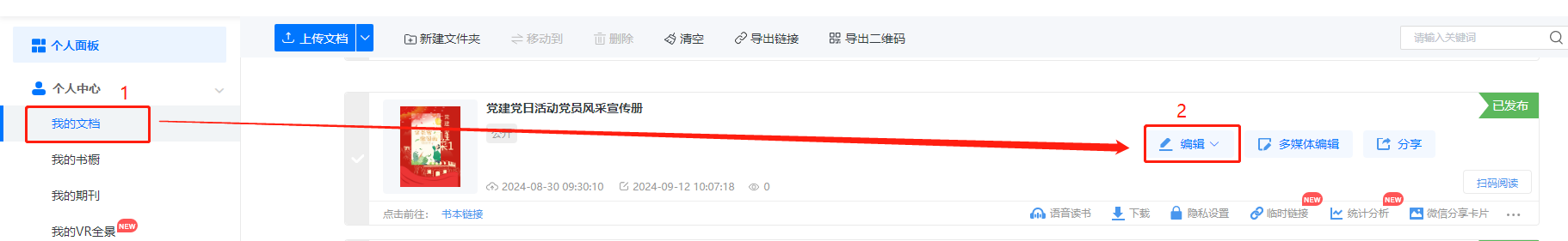 點進(jìn)【我的文檔】,找到對應(yīng)書本,點擊【編輯】,打開書本編輯界面。