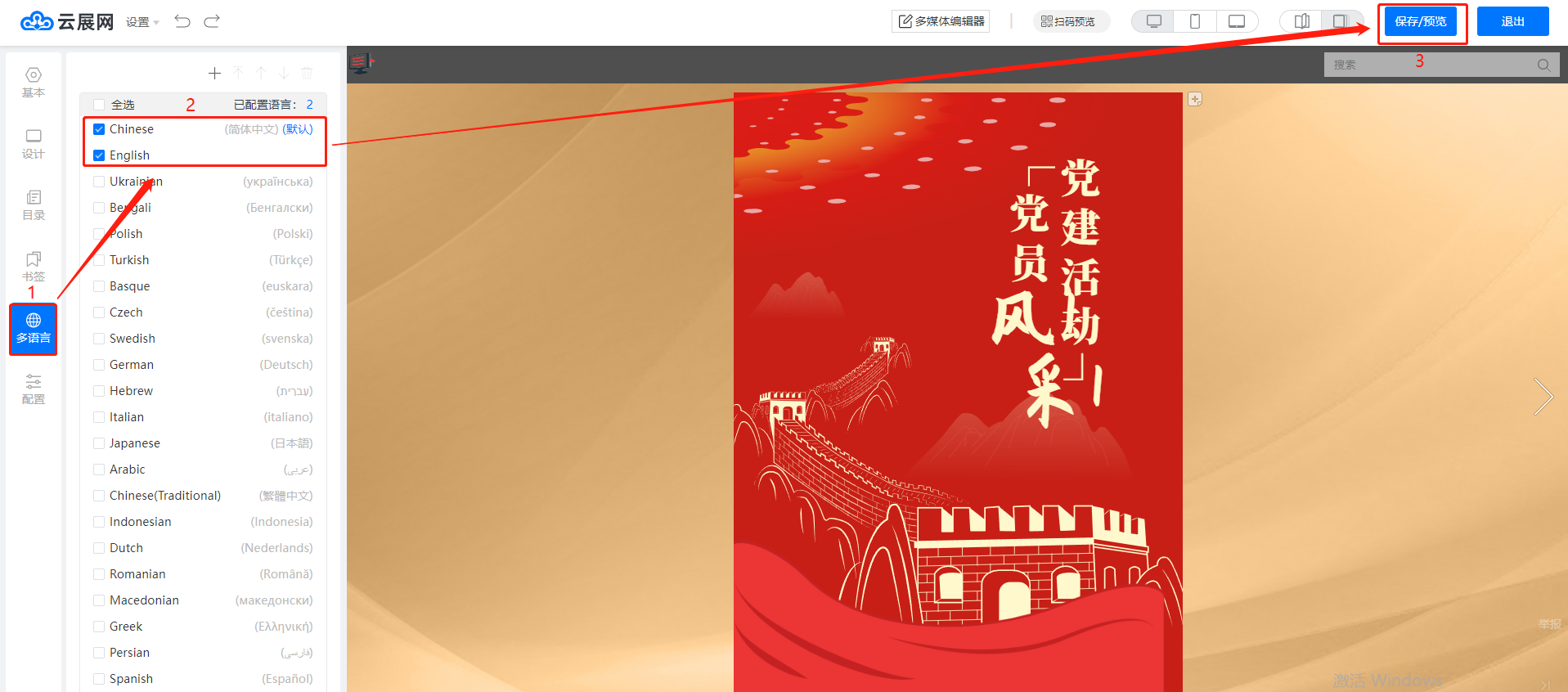 點擊【多語言】,勾選需要給讀者選擇的語種,點擊【保存/預(yù)覽】。