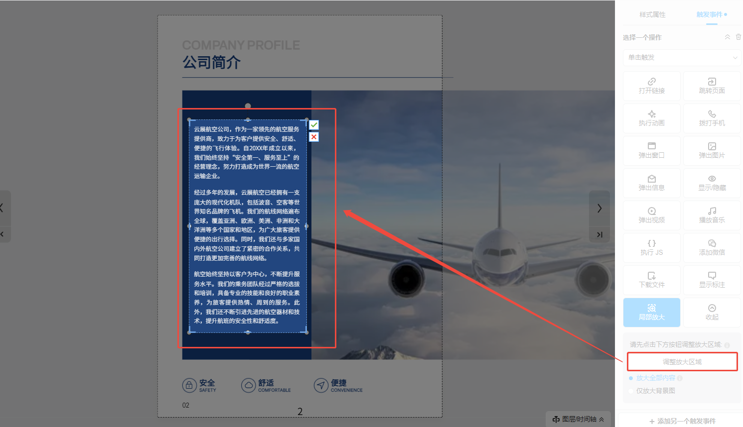 點擊【鏈接】,將鏈接框覆蓋到對應的位置,然后點擊【觸發(fā)事件】,選擇【局部放大】,點擊【調(diào)整放大區(qū)域】,選取需要放大的區(qū)域,選取之后選擇放大全部內(nèi)容或者僅放大背景圖。