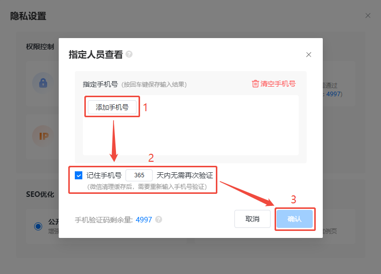 點擊【添加手機(jī)號】輸入一個或者多個手機(jī)號,如果您希望讀者在設(shè)定的時間段內(nèi)再次訪問時無需再驗證,還可以選擇勾選下方的【記住密碼】,并設(shè)置間隔時間,最后點擊【確認(rèn)】。