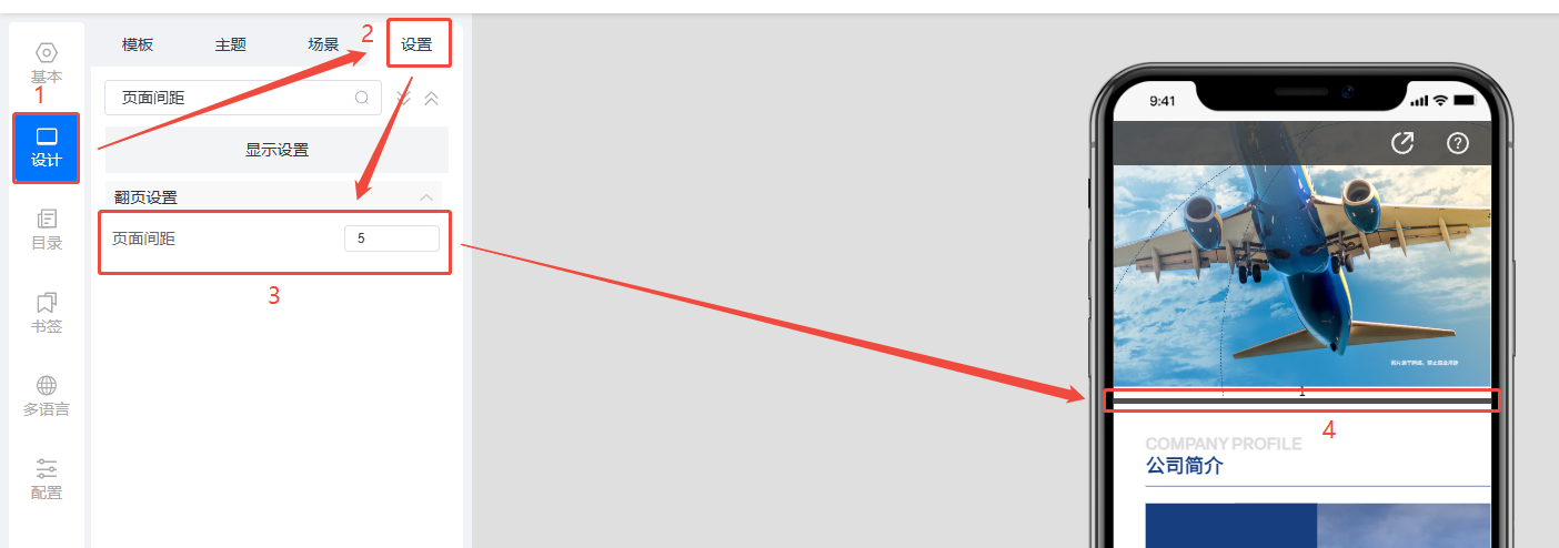 點擊【設(shè)計】,然后點擊【設(shè)置】,設(shè)置【頁面間距】,頁面間距就是兩頁之間的距離,建議設(shè)置為【5】。