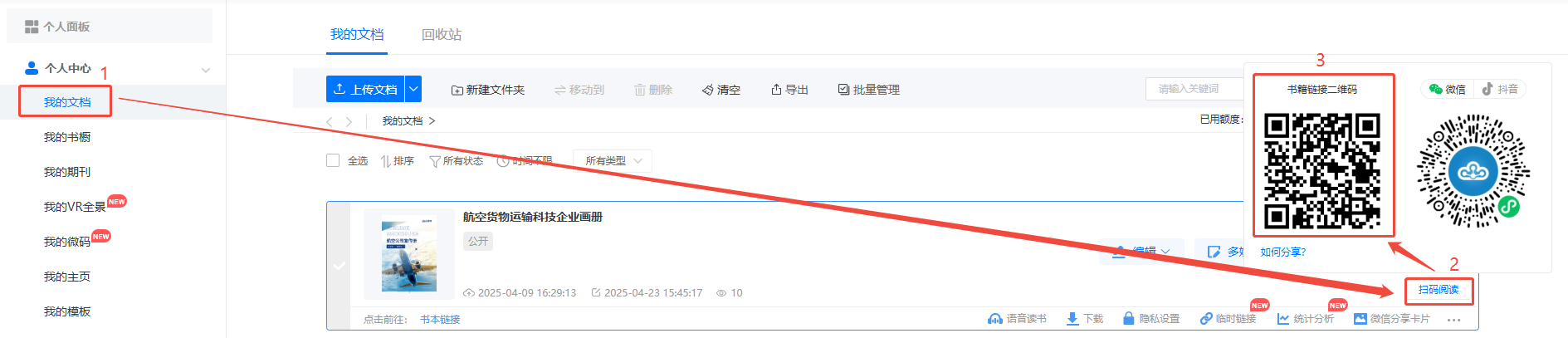在【我的文檔】頁面,點擊【掃碼閱讀】,找到書籍鏈接二維碼。