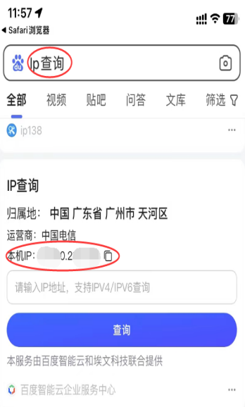 在電腦或者手機(jī)的瀏覽器上搜索【IP查詢(xún)】就可以獲取當(dāng)前的網(wǎng)絡(luò)IP地址。