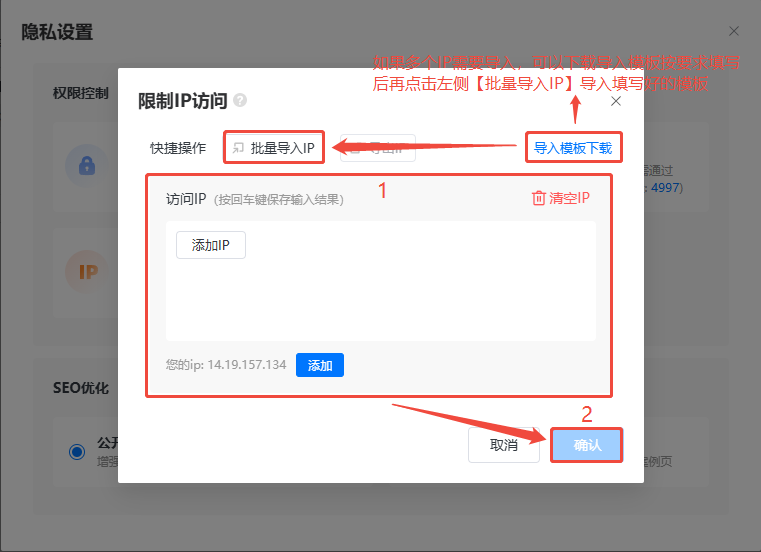 1、如果有多個(gè)IP地址需要導(dǎo)入,可以點(diǎn)擊右上角【導(dǎo)入模板下載】,下載導(dǎo)入模板按要求填寫(xiě)后再點(diǎn)擊左側(cè)【批量導(dǎo)入IP】導(dǎo)入填寫(xiě)好的模板,再點(diǎn)擊【確認(rèn)】即可。