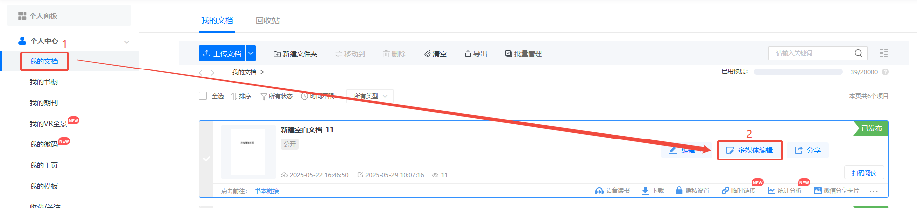 點(diǎn)進(jìn)【我的文檔】/【文檔】,選擇對(duì)應(yīng)電子書(shū),點(diǎn)擊【多媒體編輯】/【內(nèi)容編輯】。
