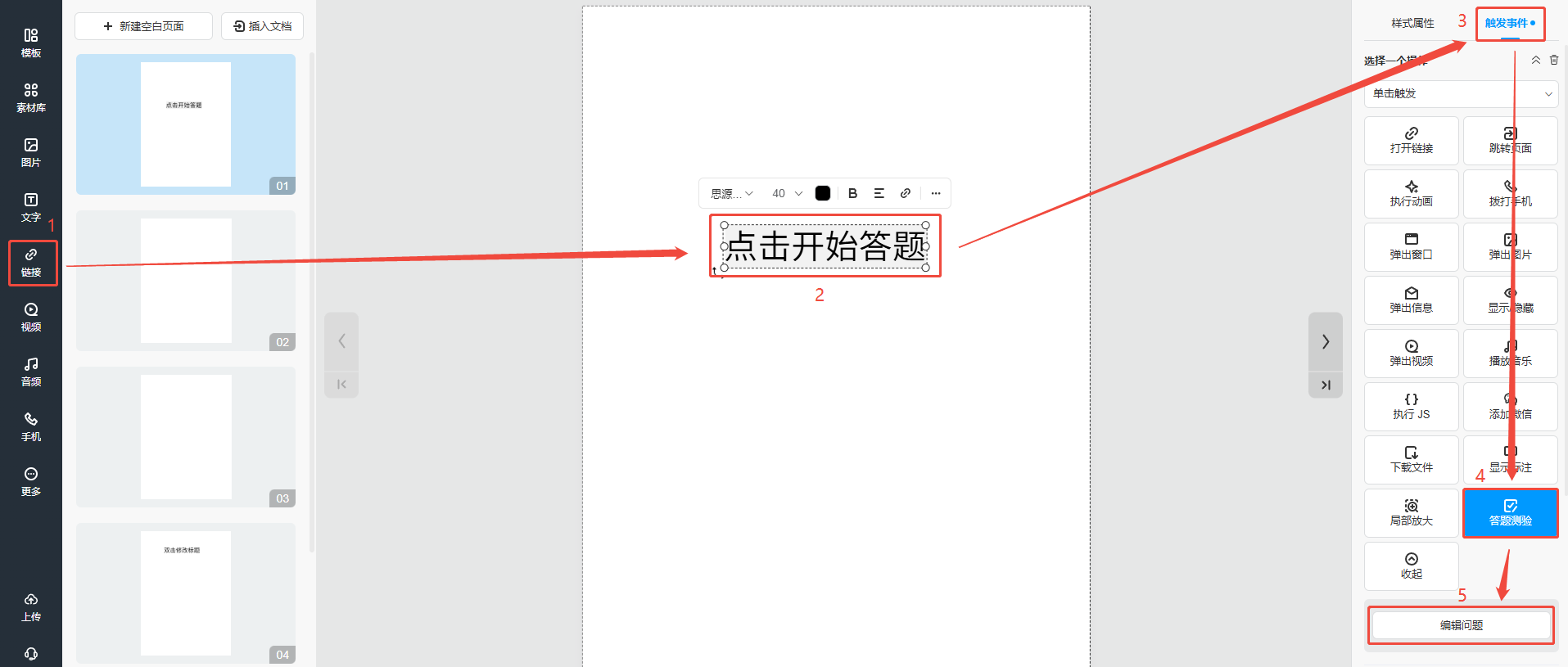 點(diǎn)擊【鏈接】,將出現(xiàn)在頁(yè)面上超鏈接放置到文字或者圖片上,點(diǎn)擊右上角【觸發(fā)事件】,選擇【答題測(cè)驗(yàn)】,點(diǎn)擊【編輯問(wèn)題】。