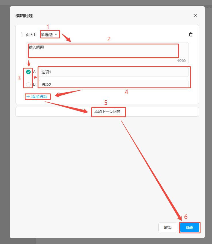 在【單選題】選擇題目為單選題或者多選題,下方輸入問(wèn)題題目,勾選其中一個(gè)選項(xiàng)為正確答案(如果是多選題可勾選多個(gè)),右側(cè)編輯選項(xiàng),如果想要增加多個(gè)選項(xiàng),可以點(diǎn)擊【+添加選項(xiàng)】增加,如果需要添加多個(gè)問(wèn)題,可以點(diǎn)擊【添加下一頁(yè)問(wèn)題】,全都編輯好之后點(diǎn)擊【確定】。