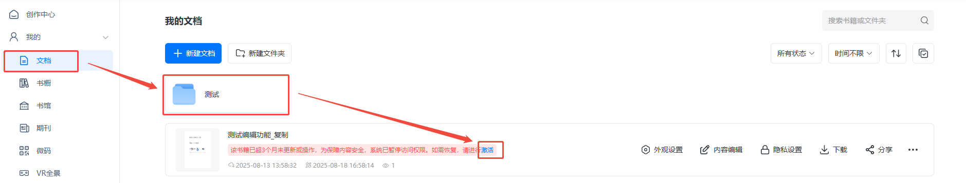 為進(jìn)一步保障內(nèi)容安全,免費(fèi)用戶的書籍若連續(xù)三個月內(nèi)無任何編輯、修改等更新操作,或者付費(fèi)會員會員資格到期滿三個月起,系統(tǒng)將對書籍進(jìn)行暫時停止訪問處理,用戶登錄賬戶并完成激活操作后,可立即恢復(fù)書籍的正常訪問權(quán)限。