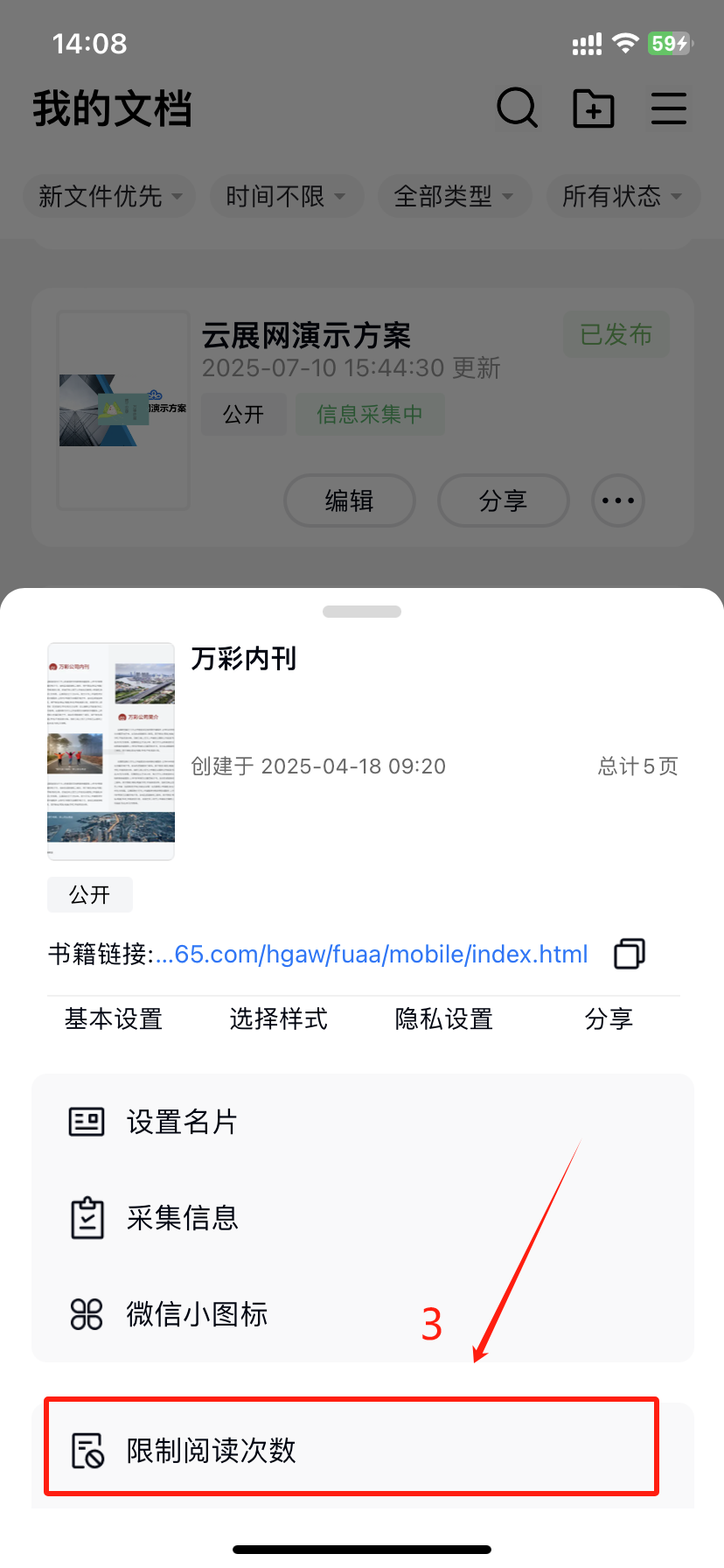 在【作品】頁面,點擊三個點【…】按鈕打開,找到【限制閱讀次數(shù)】點擊