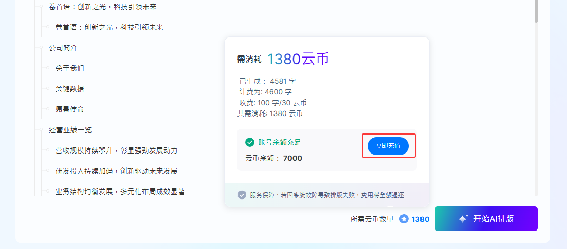 收費(fèi)時(shí)機(jī): 大綱生成完成后,用戶瀏覽計(jì)費(fèi)明細(xì),點(diǎn)擊【開始AI排版】按鈕,即扣除云幣。