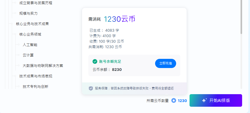 2). 等待AI分析主題并生成大綱 → 編輯大綱標(biāo)題或正文 → 預(yù)覽需消耗的云幣→ 點(diǎn)擊【開始AI排版】進(jìn)入多媒體編輯器排版。