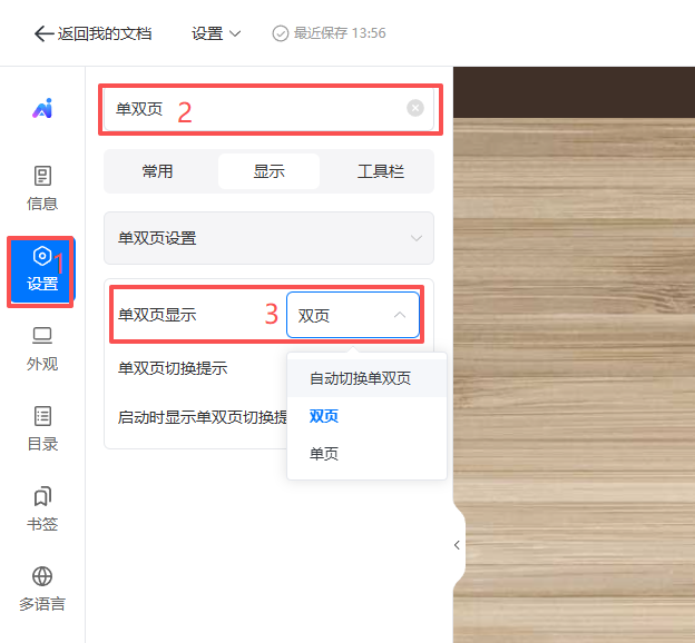 點擊【設(shè)置】,在搜索欄輸入“單雙頁”,【單雙頁顯示】選擇“雙頁”即可。
