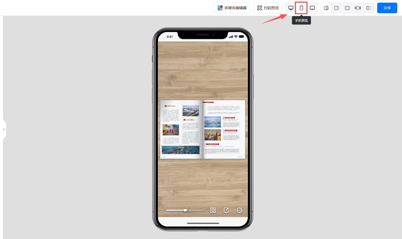 點擊右上角的手機(jī)預(yù)覽按鈕,可查看手機(jī)端豎屏雙頁效果