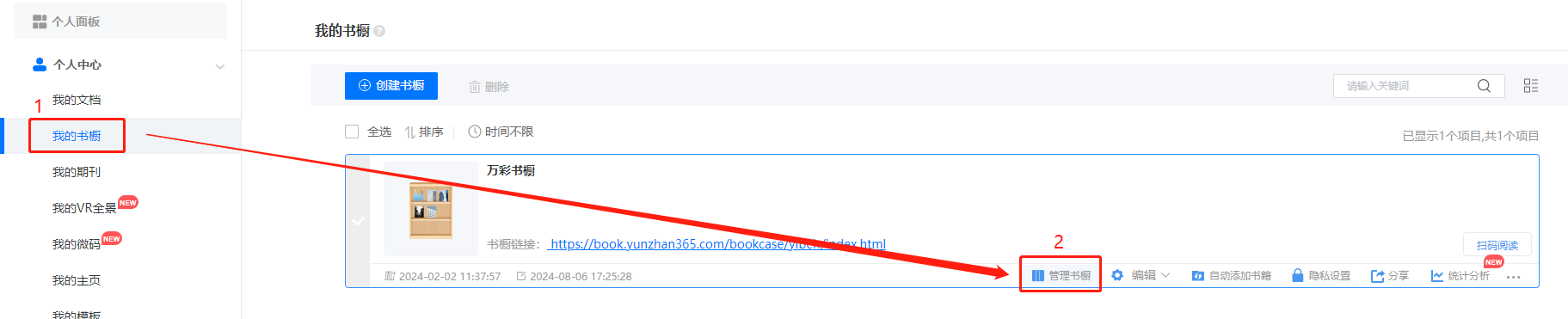 (1)點(diǎn)擊【我的書櫥】找到對(duì)應(yīng)書櫥,點(diǎn)擊【管理書櫥】,進(jìn)入管理書櫥界面。