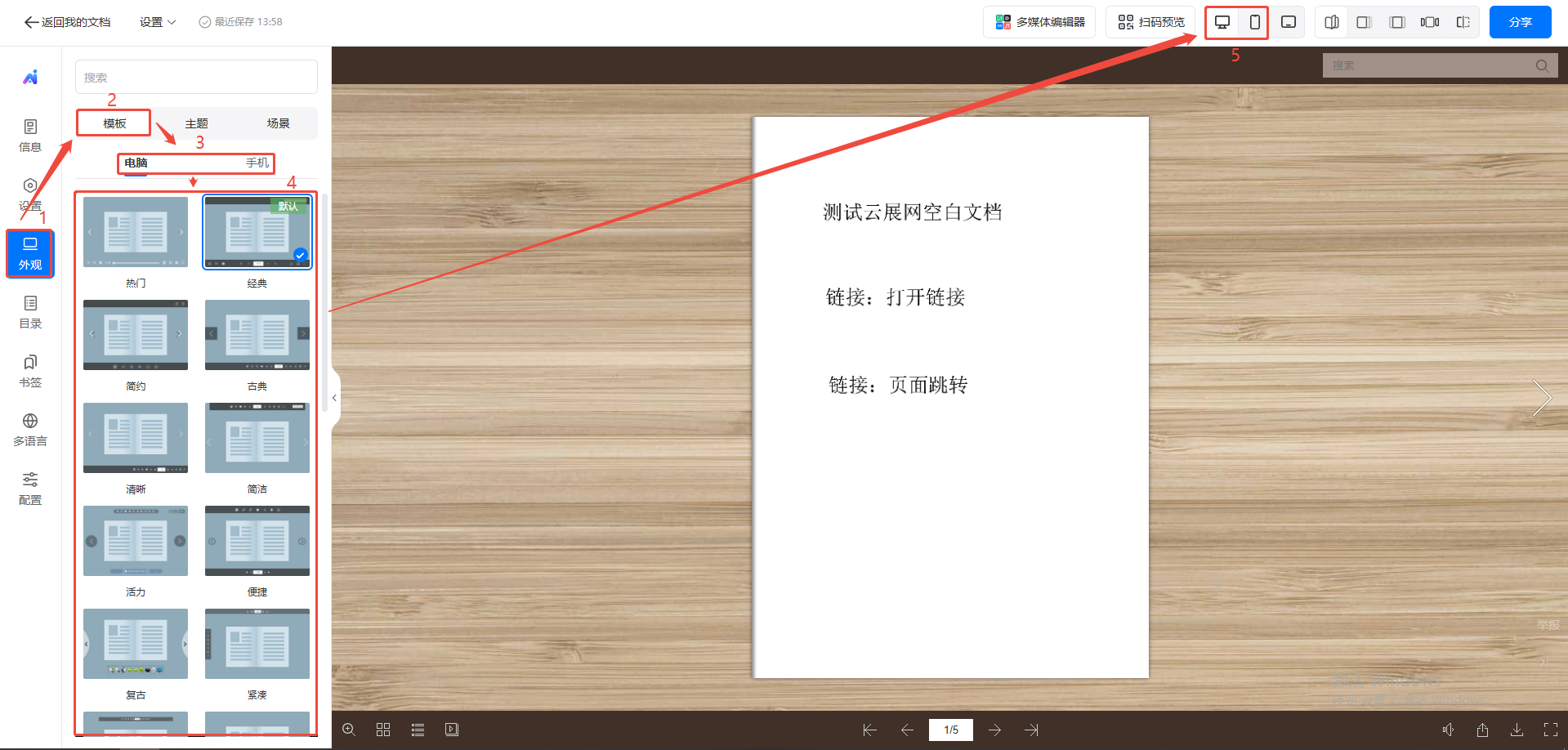 點擊【外觀】,再點擊【模板】,根據(jù)需要點擊【電腦】或者【手機】選擇想要的工具欄模板,單擊應用之后點擊右上角電腦圖標和手機圖標切換查看效果。