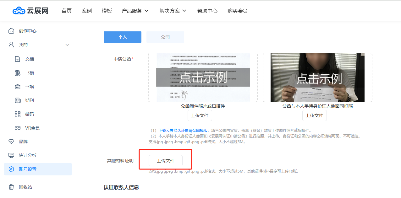 如果您上傳的資料屬于公司/單位的,請選擇公司進行認證。如果您上傳的資料屬于您個人所有,請選擇個人進行認證。如果您上傳的是公司的文件卻選擇了個人認證,認證不會通過。