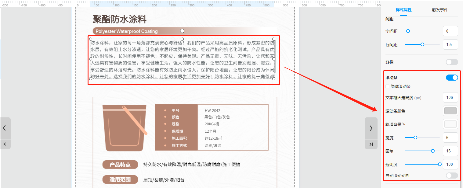 當(dāng)文字段落太長,又不想它占據(jù)頁面太多面積時,可以選中文本框并打開【滾動條】,這樣可以縮小文本框的面積,讀者可以滑動觀看后面的內(nèi)容。