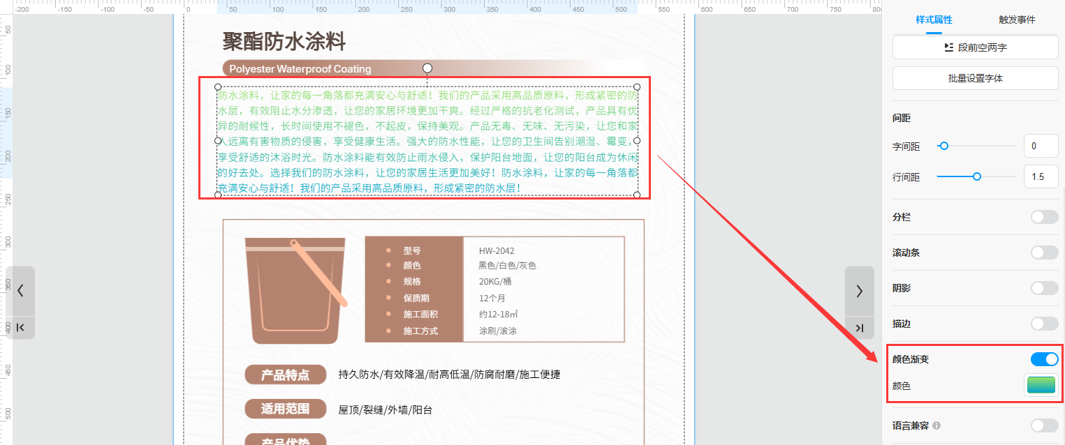 選中你所需要修改的文本框,打開【顏色漸變】,并選擇喜歡的顏色,就可以給文字段落增加顏色漸變的效果。