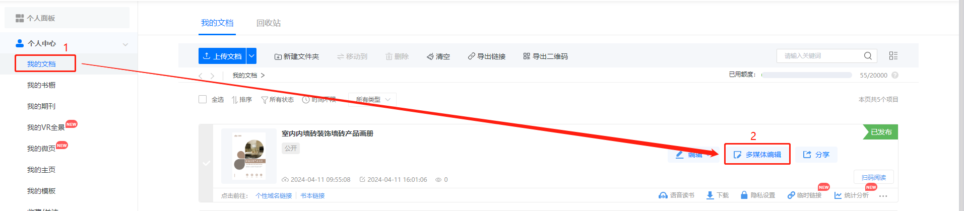 點進(jìn)【我的文檔】/【文檔】,選擇對應(yīng)電子書,點擊【多媒體編輯】/【內(nèi)容編輯】。