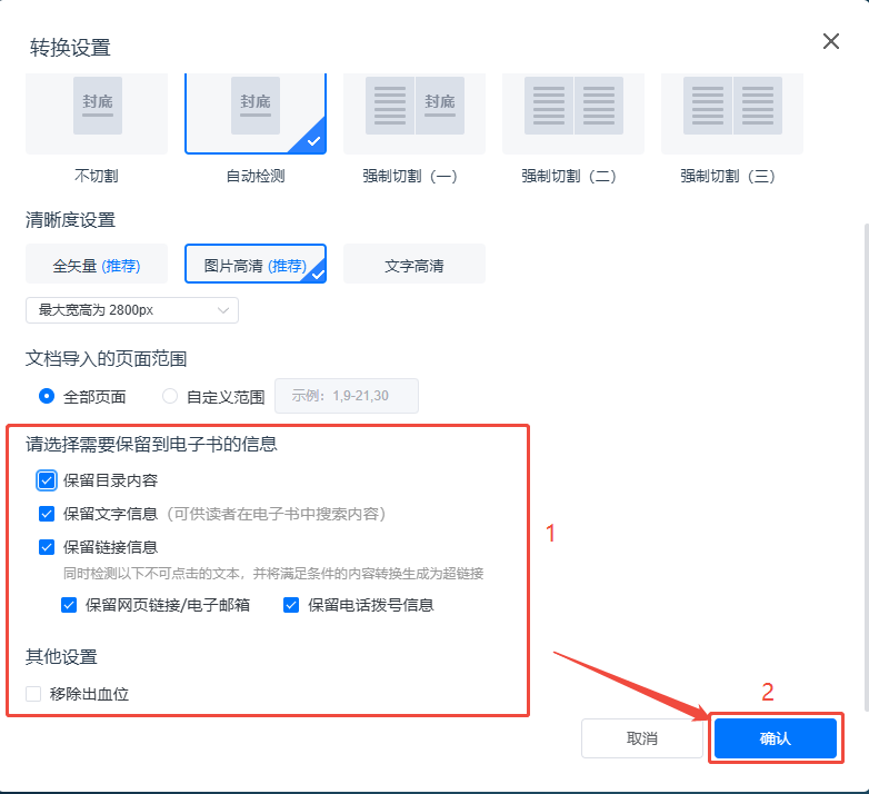 根據(jù)自身需要,勾選需要保留的信息即可,如果上傳的PDF上有出血位可以勾選【移除出血位】,點擊【確認】即可。