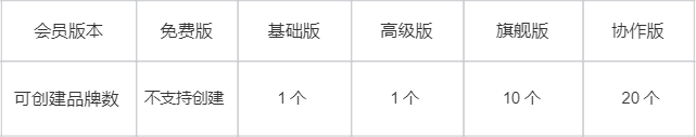 一個品牌信息對應一個logo,可創(chuàng)建品牌的數(shù)量根據(jù)會員版本不同而不同,請看: