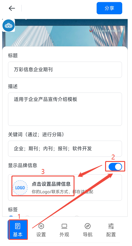 點擊【基本】,打開【顯示品牌信息】,然后點擊【點擊設置品牌信息】,最后點擊【新建品牌信息】。