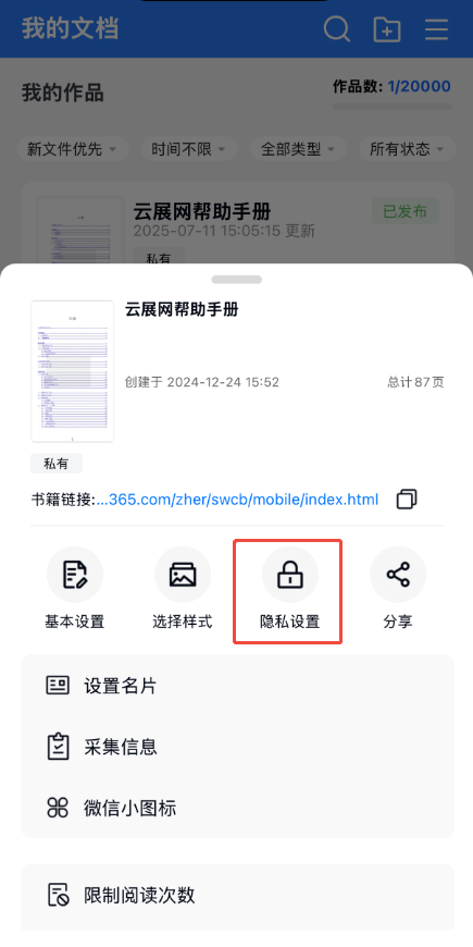 打開云展app,點擊【作品】,點擊書本旁邊三個點,然后點擊【隱私設(shè)置】。