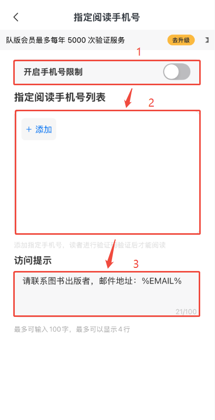 點擊【設(shè)置閱讀指定手機號】,將【開啟手機號限制】打開,在下方手機號列表框輸入手機號,可以輸入一個或者多個,也可以根據(jù)自己需要設(shè)置訪問提示,設(shè)置完點左上角箭頭退出即可。