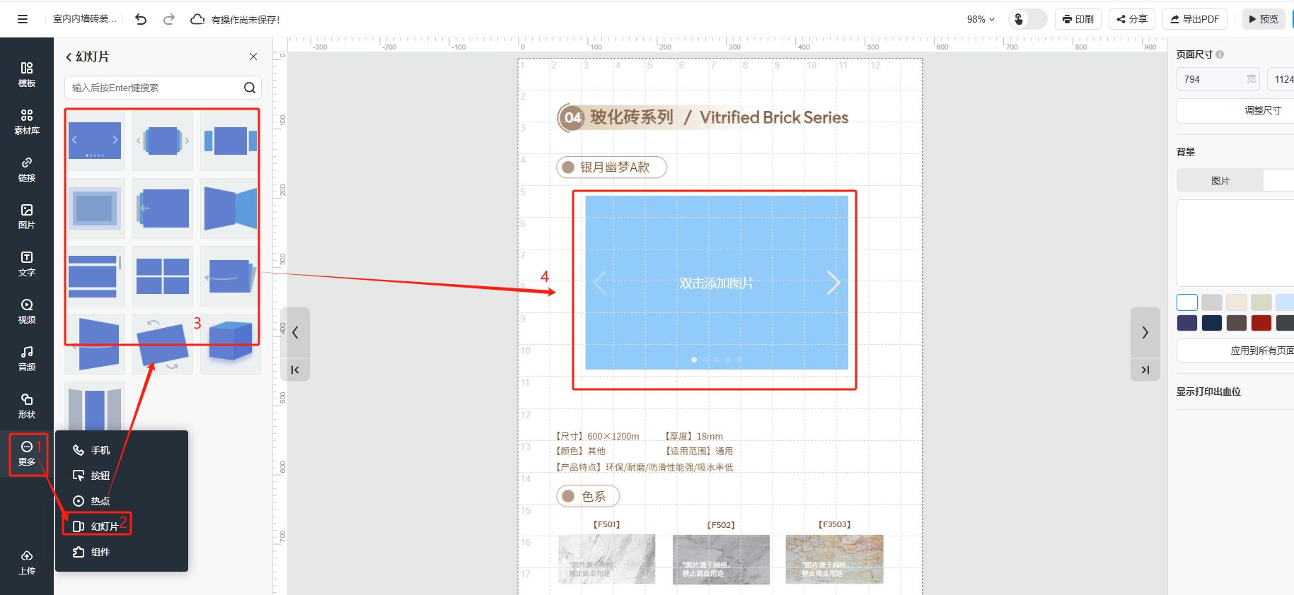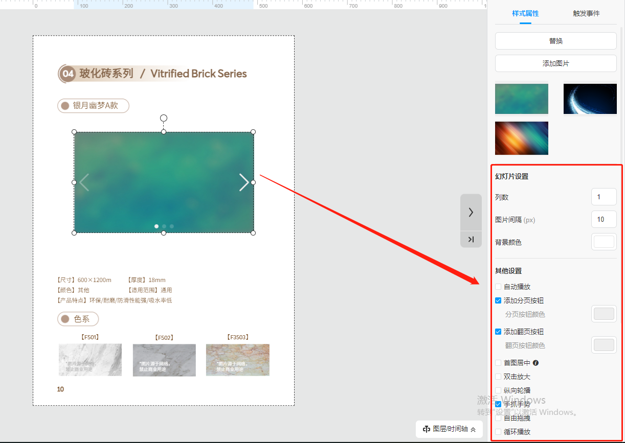 點(diǎn)擊【更多】,選擇【幻燈片】,挑選一個(gè)幻燈片的樣式,頁(yè)面會(huì)出現(xiàn)一個(gè)幻燈片組件