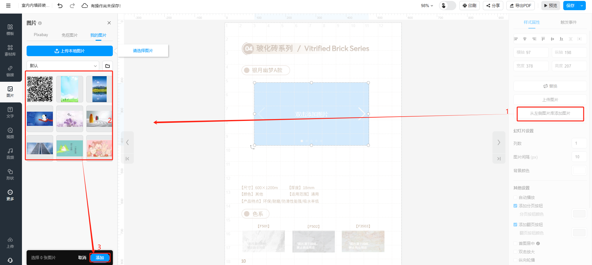 點(diǎn)擊【從左側(cè)圖片庫(kù)添加圖片】,在左側(cè)的圖片庫(kù)選擇圖片后,點(diǎn)擊【添加】,將圖片添加到幻燈片中