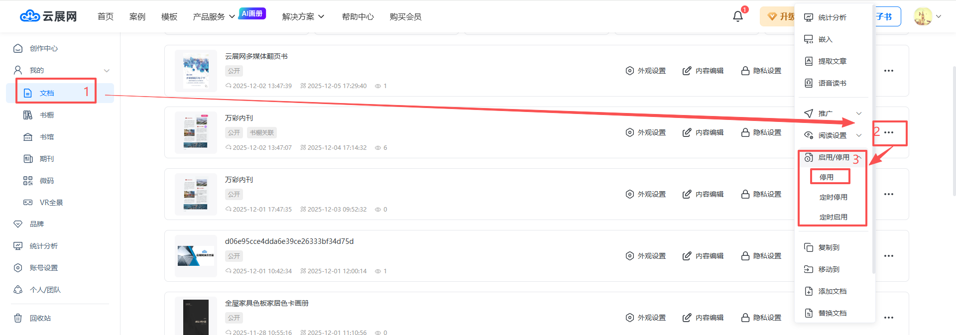 在【文檔】頁面,選擇需停用的電子書,點(diǎn)擊【…】,選擇【啟用/停用】中的【停用】即可停用該電子書。