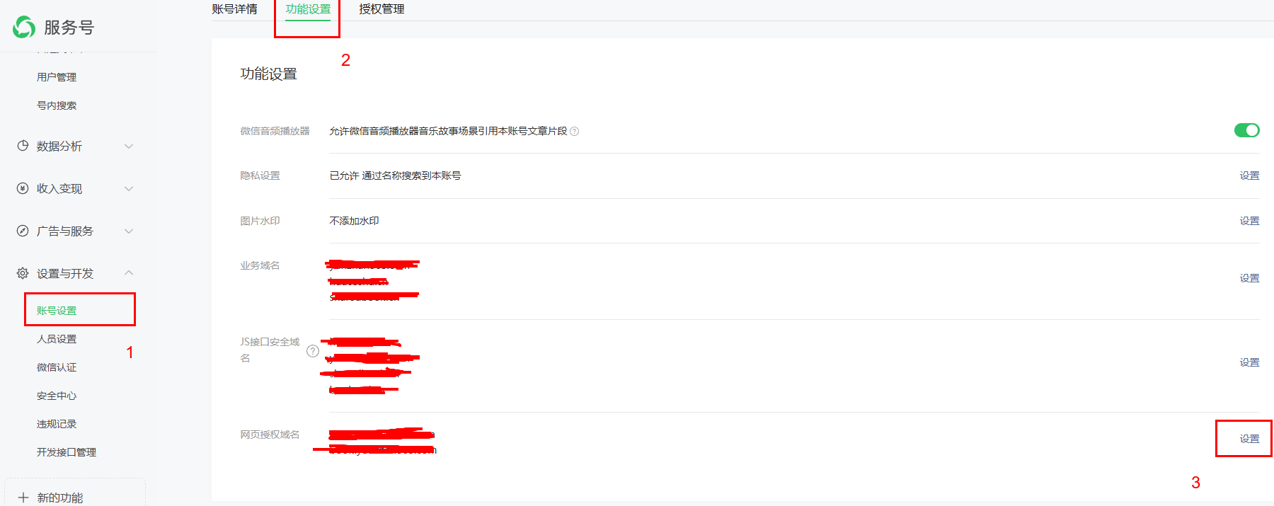 1)登錄微信公眾號,設(shè)置與開發(fā),賬號設(shè)置,功能設(shè)置,點擊網(wǎng)頁授權(quán)域名按鈕