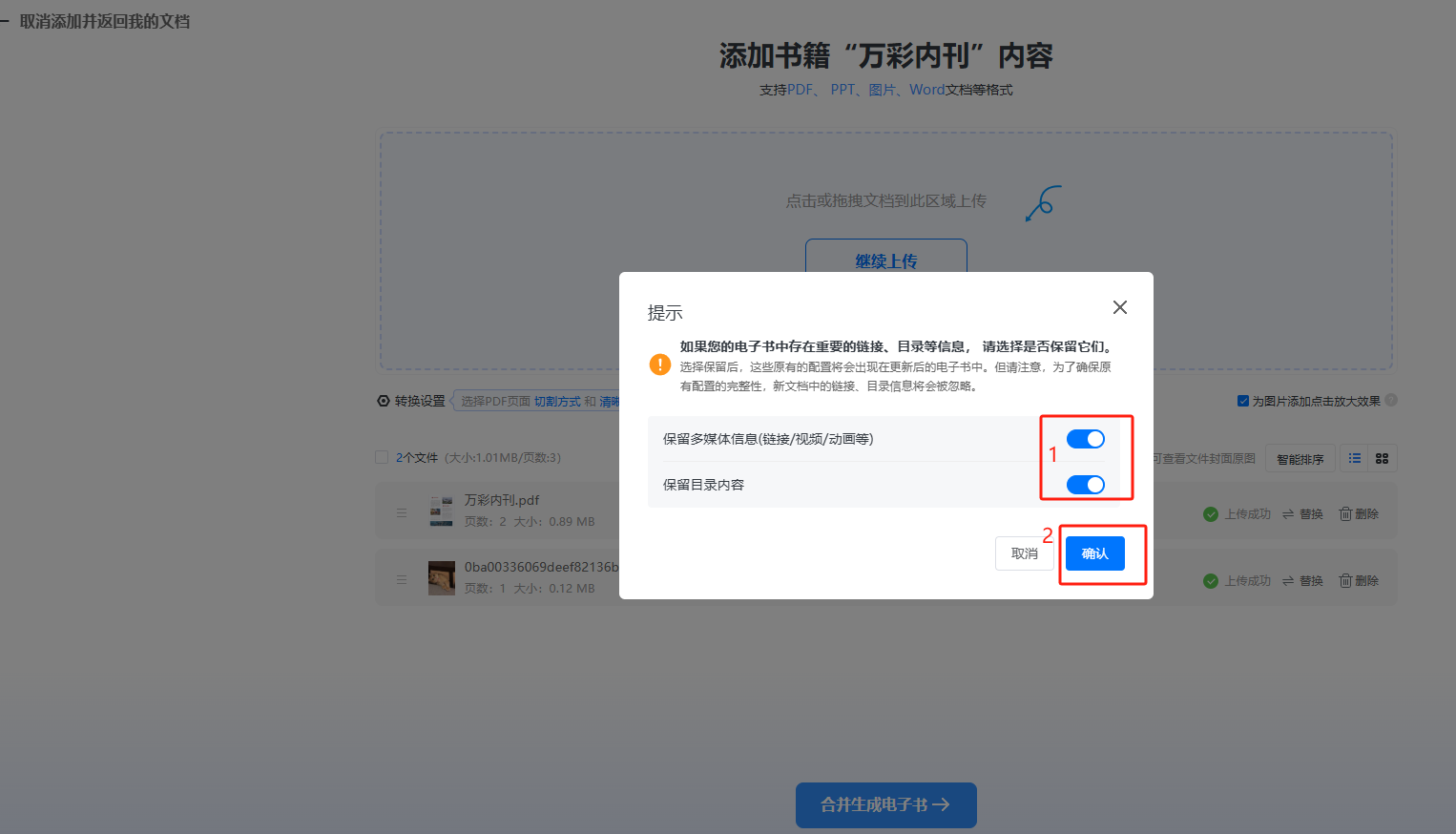 4、如果書本中有存在超鏈接/視頻/動(dòng)畫和目錄等功能,并且您需保留這些功能,請(qǐng)勾選“保留多媒體信息(鏈接/視頻/動(dòng)畫等)”和勾選”保留目錄內(nèi)容”,勾選后點(diǎn)擊【確認(rèn)】。