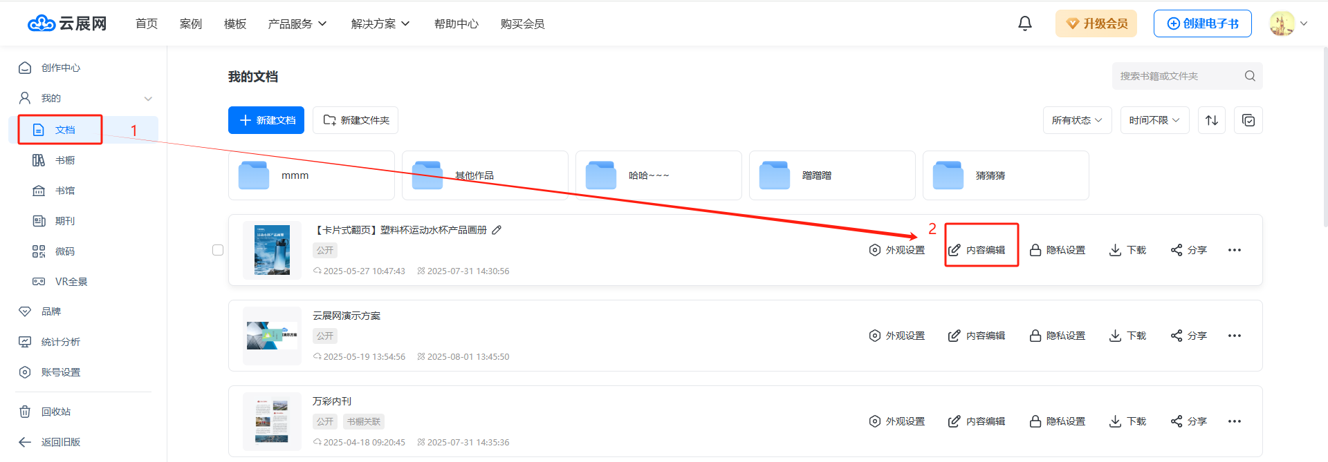1、在【文檔】頁(yè)面,找到需要增加頁(yè)面的書本后點(diǎn)擊【內(nèi)容編輯】。