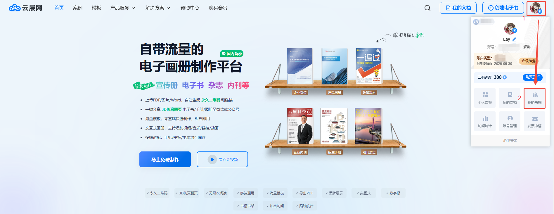 將鼠標(biāo)懸停在云展網(wǎng)首頁右上角我的賬號上,點擊【我的書櫥】進(jìn)入界面。