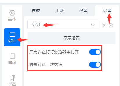 2.點擊“設(shè)計”,點擊“設(shè)置”,搜索框搜索“釘釘”,打開以下兩個配置