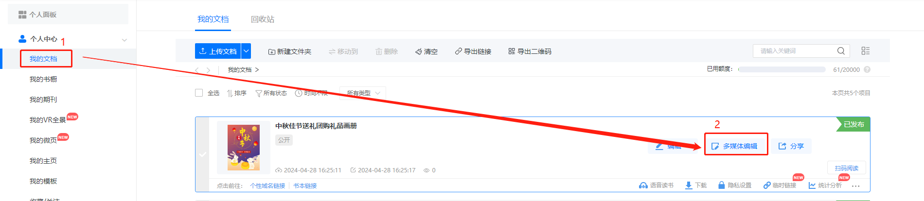 點(diǎn)進(jìn)【我的文檔】/【文檔】,選擇對(duì)應(yīng)電子書,點(diǎn)擊【多媒體編輯】/【內(nèi)容編輯】。