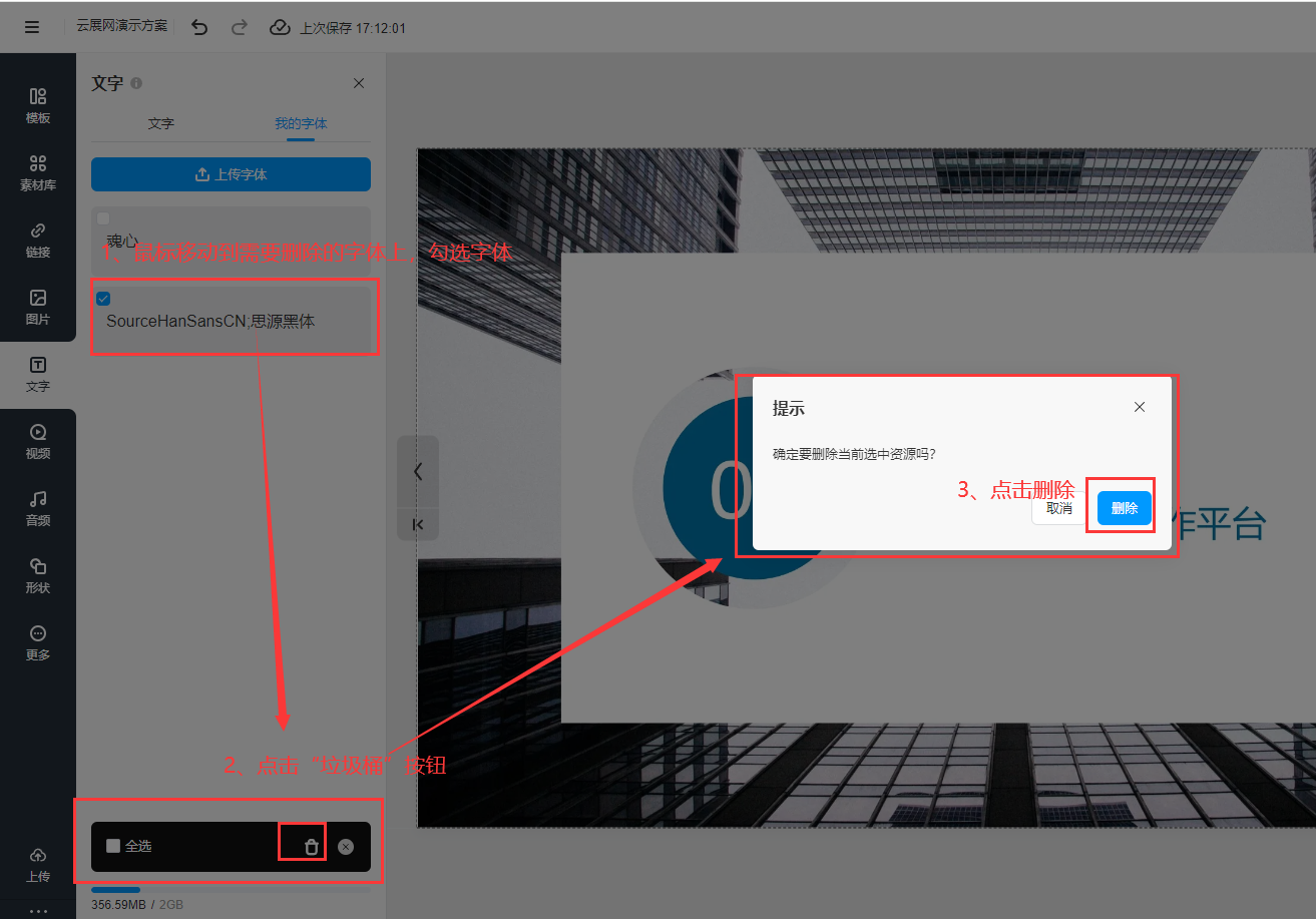 點(diǎn)擊【文字】,選擇【我的字體】,找到需要?jiǎng)h除的字體,勾選字體后點(diǎn)擊【刪除】,刪除后,之前使用這個(gè)字體的文字自動(dòng)變更為思源黑體。
