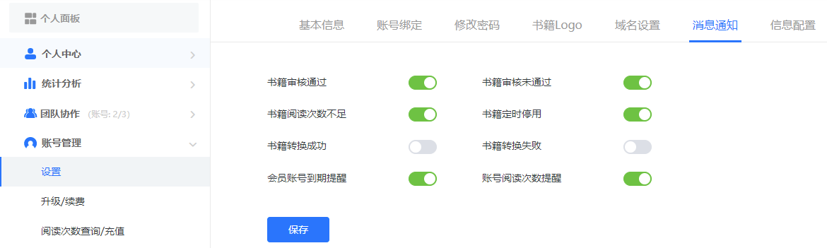 用戶注冊成功后,默認(rèn)接受上傳書籍審核通過與審核未通過的郵件通知。如果不想收到該郵件,或者只接受某類郵件,請再信息通知欄設(shè)置相關(guān)信息。
