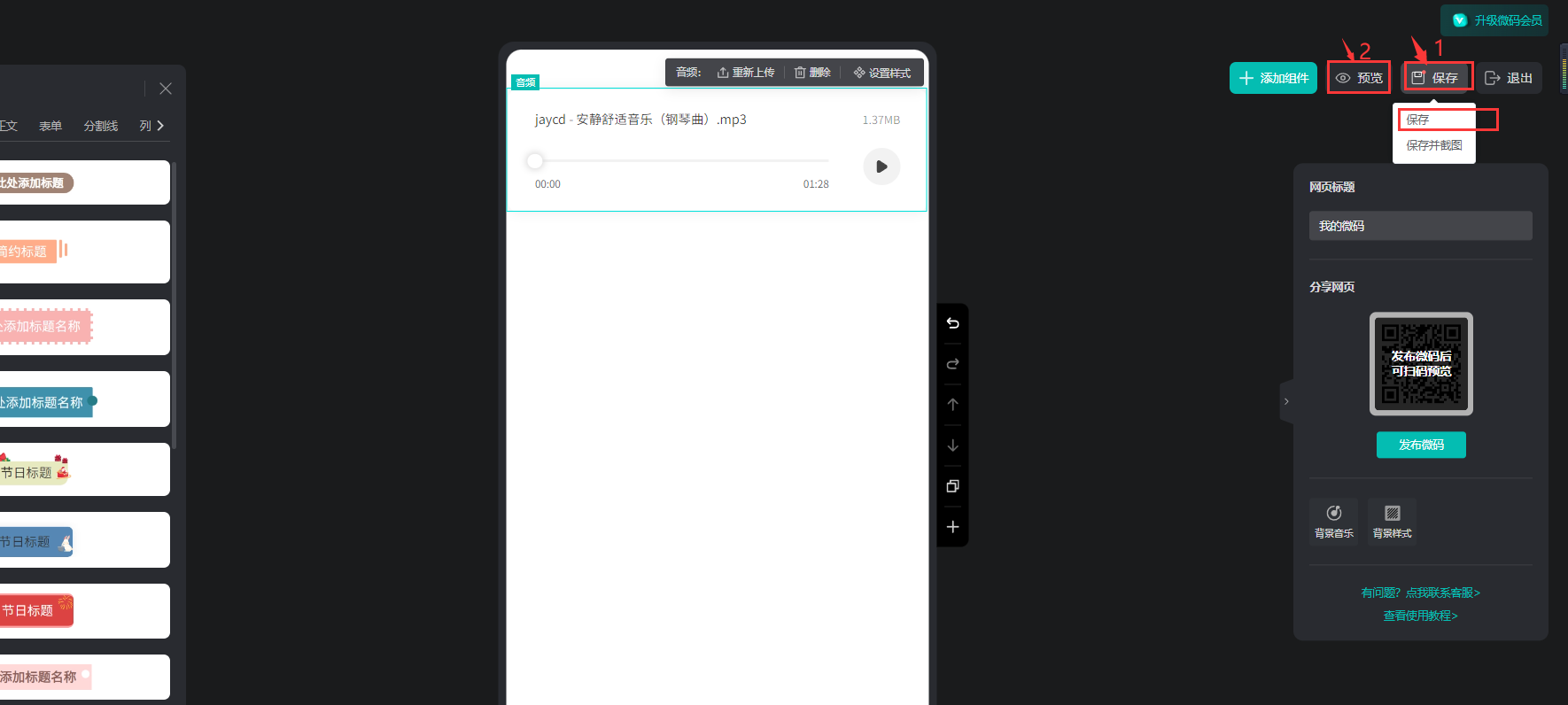 點(diǎn)擊【添加組件】,點(diǎn)擊【音頻】,上傳mp3格式的音頻文件添加到頁(yè)面上