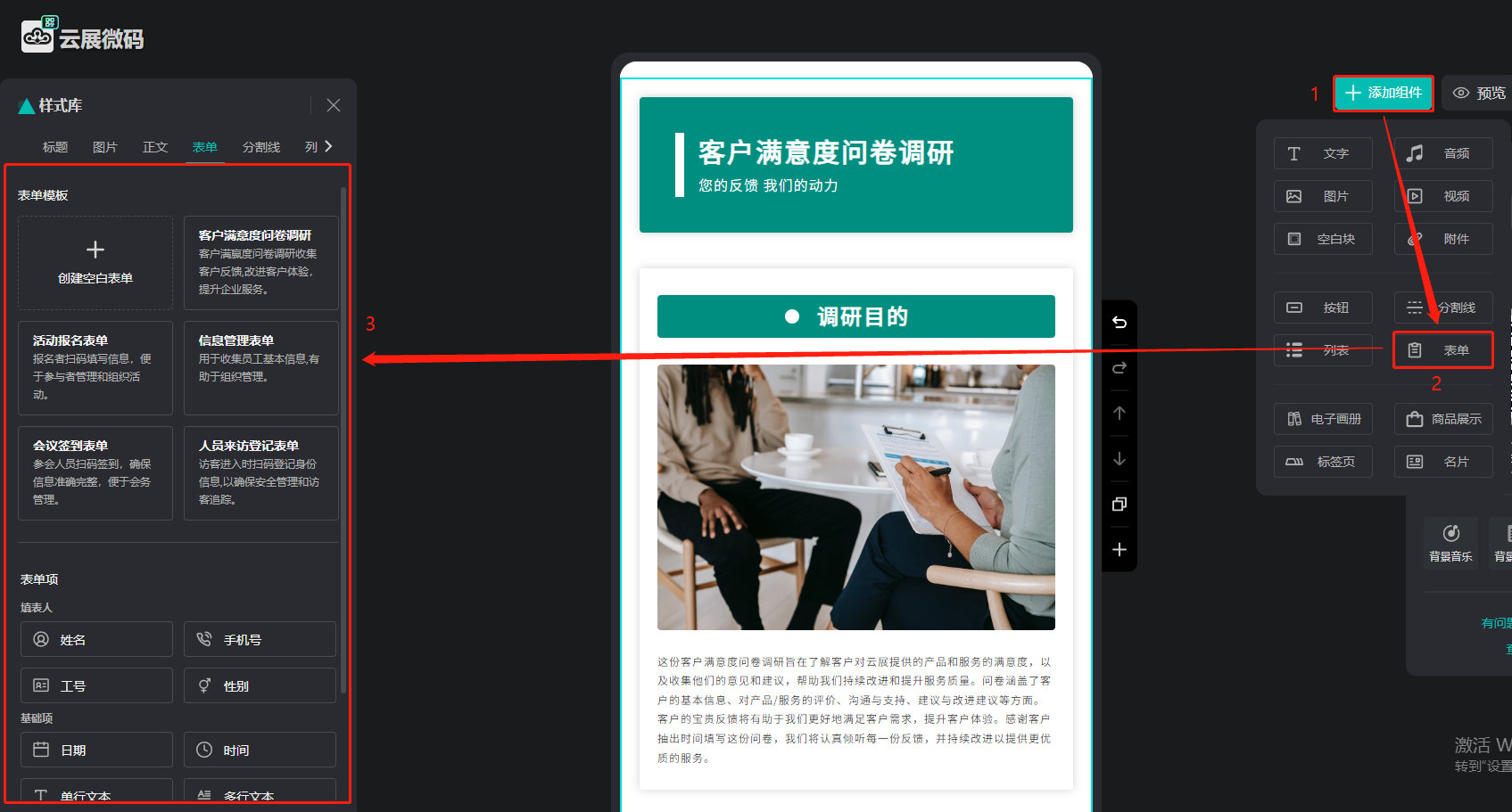 點(diǎn)擊【添加組件】,點(diǎn)擊【表單】,左側(cè)選擇【表單模板】,如有需要也可以添加【表單項(xiàng)】。