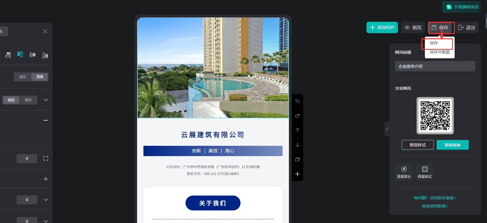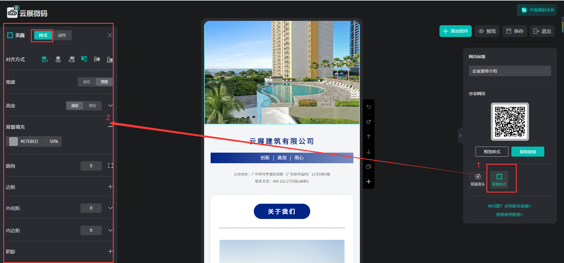 如何設置微碼背景樣式? 一、功能介紹 背景樣式設置指的是調整微碼頁面布局,使頁面更加美觀,可以設置對齊方式、背景補充、內外邊距等 二、操作步驟 1、打開微碼的編輯頁面 在【我的微碼】,點擊【編輯】進入 2、背景樣式設置 點擊【背景樣式】,在左側設置參數 3、保存 點擊右邊的【保存】圖標保存