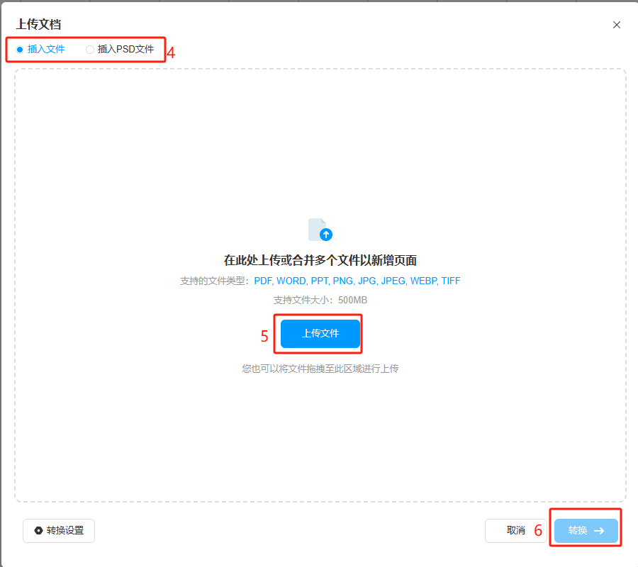 選擇需要替換的頁(yè)面,點(diǎn)擊【插入文檔】,選擇要插入的文件類型,然后點(diǎn)擊選擇文件上傳新文件,再選擇需要插入的文件進(jìn)行轉(zhuǎn)換。